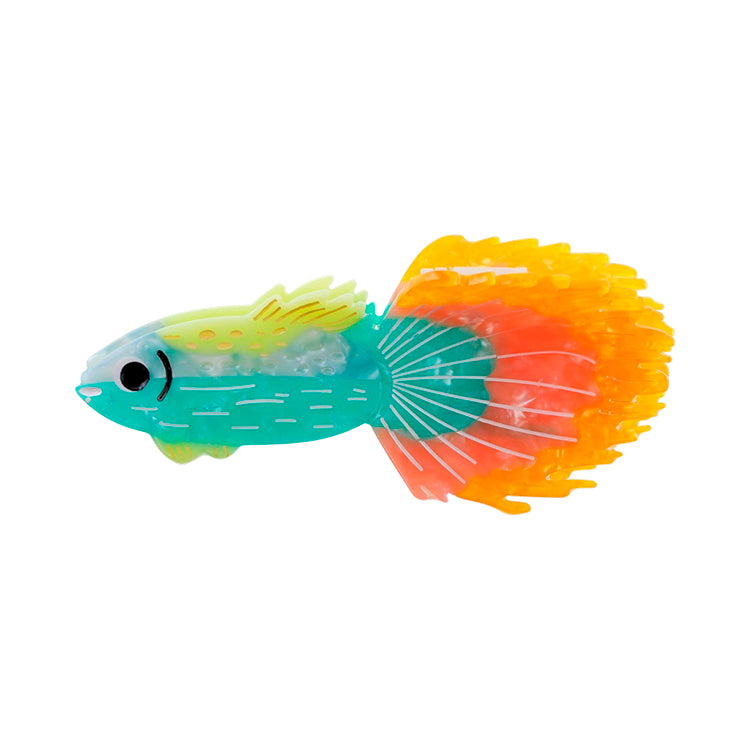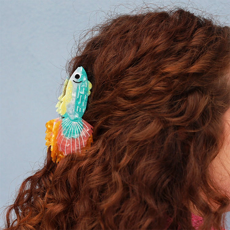 Dekorativ hårklemme formet som en farverig fisk. Det legende design i klare farver giver et iøjnefaldende udtryk, mens klemmen holder håret sikkert på plads.