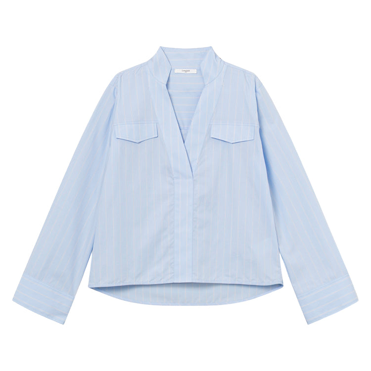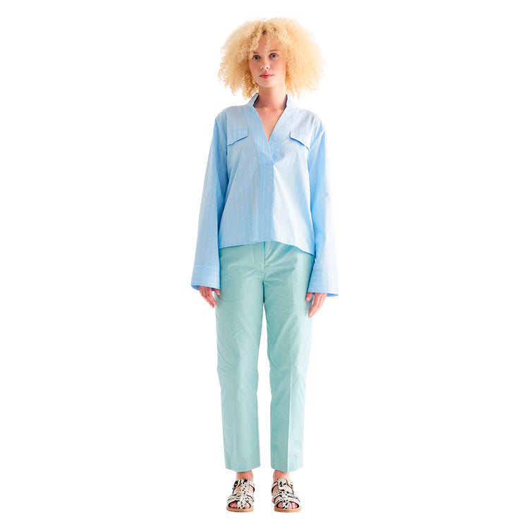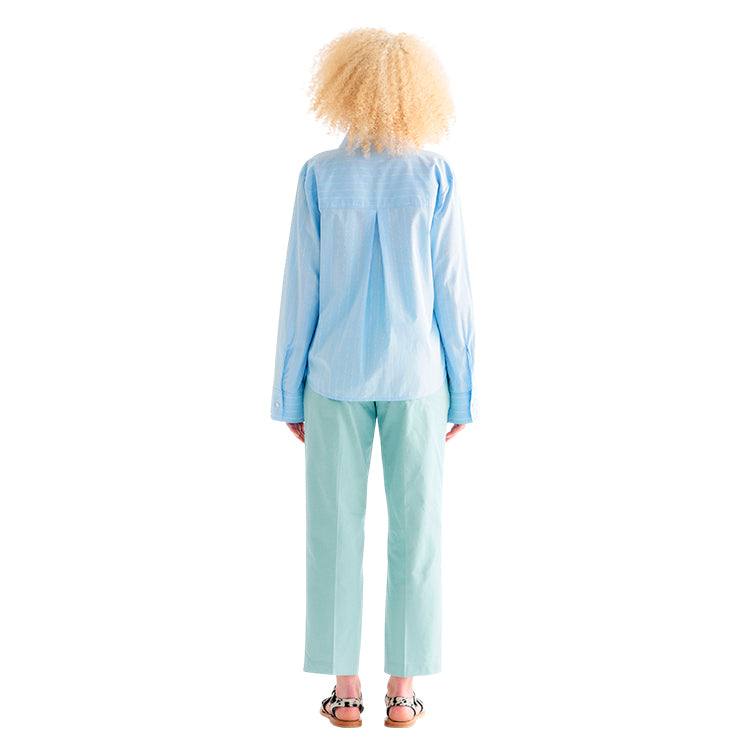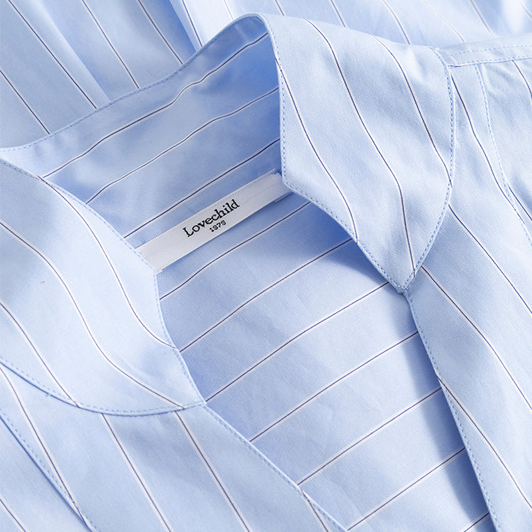 Marbella Blouse fra Lovechild 1979 er en elegant og alsidig skjortebluse af økologisk, blød og åndbar bomuld. Blusen har en v-hals med kinakrave samt manchetter med knap og slids for ekstra detaljer. Foran har den to praktiske brystlommer med lommeflap, mens den bagpå har bærestykke med læg for en flot pasform. Denne blå pinstripe bluse kombinerer stil og komfort, hvilket gør den perfekt til både hverdag og særlige lejligheder.