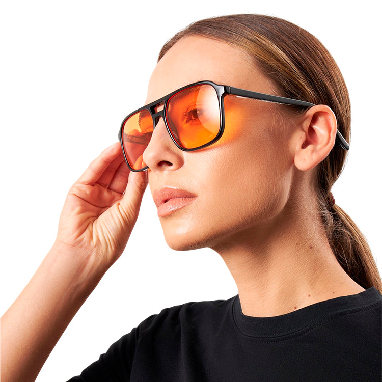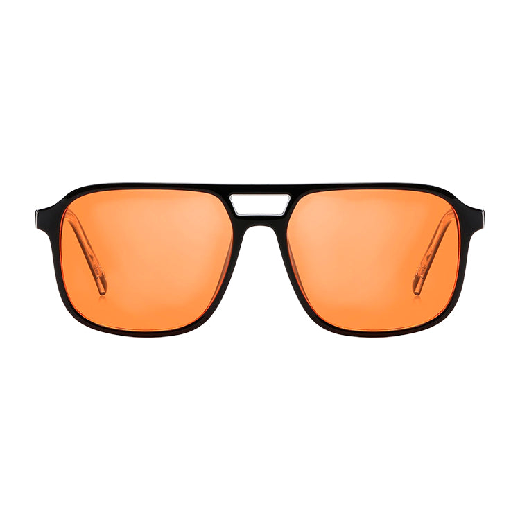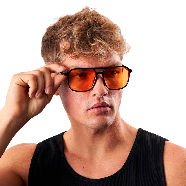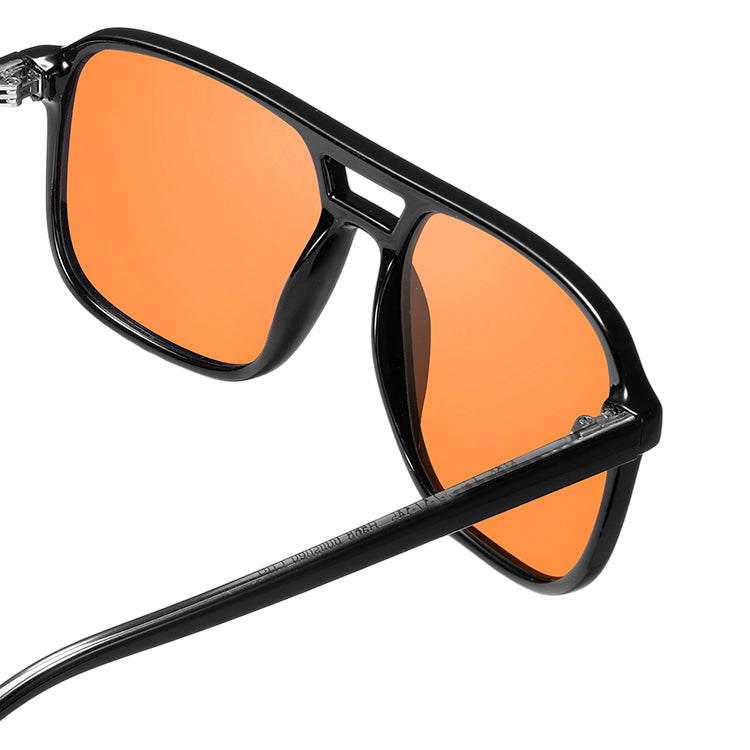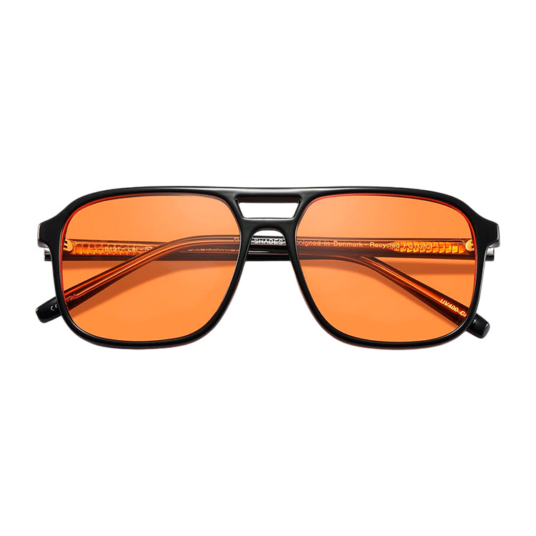 Lai solbriller fra ECO SHADES har en moderne pilotform med dobbeltbro. Den slanke profil giver stellet et let og strømlinet udtryk, der sidder komfortabelt på ansigtet. De orange brilleglas tilfører et markant og varmt udtryk, som giver brillen et retroinspireret, men moderne look. Brillerne er lavet af genanvendt plast, som er holdbart men let fleksibelt, så stellet kan tilpasse sig forskellige ansigtsformer og tåler dagligt brug. Hængslerne er kraftige 5-leds optiske hængsler, som sikrer stabilitet og lang levetid. Solbrillerne har UV 400-beskyttelse, og med det medfølgende ECO SHADES-etui, i genanvendt materiale, kan brillerne opbevares sikkert og holdes rene.