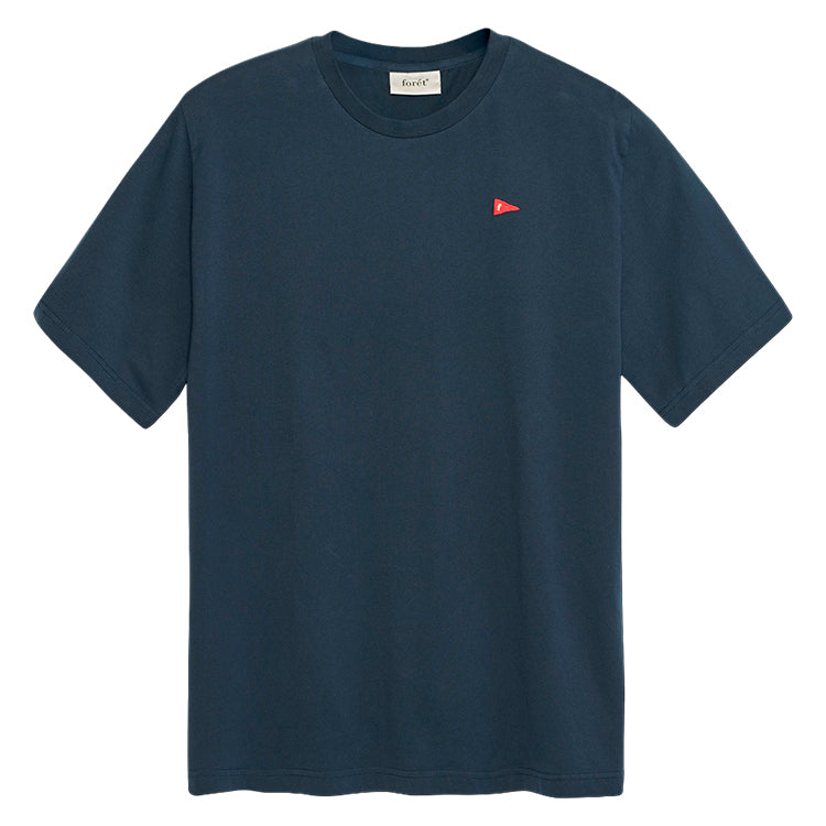 Flag T-shirt fra Forét er en enkel, korærmet t-shirt med en klassisk pasform. Den er fremstillet i blød økologisk bomuld, som gør den behagelig at have på, og dekoreret med deres lille røde vimpel med et “f” broderet på brystet.