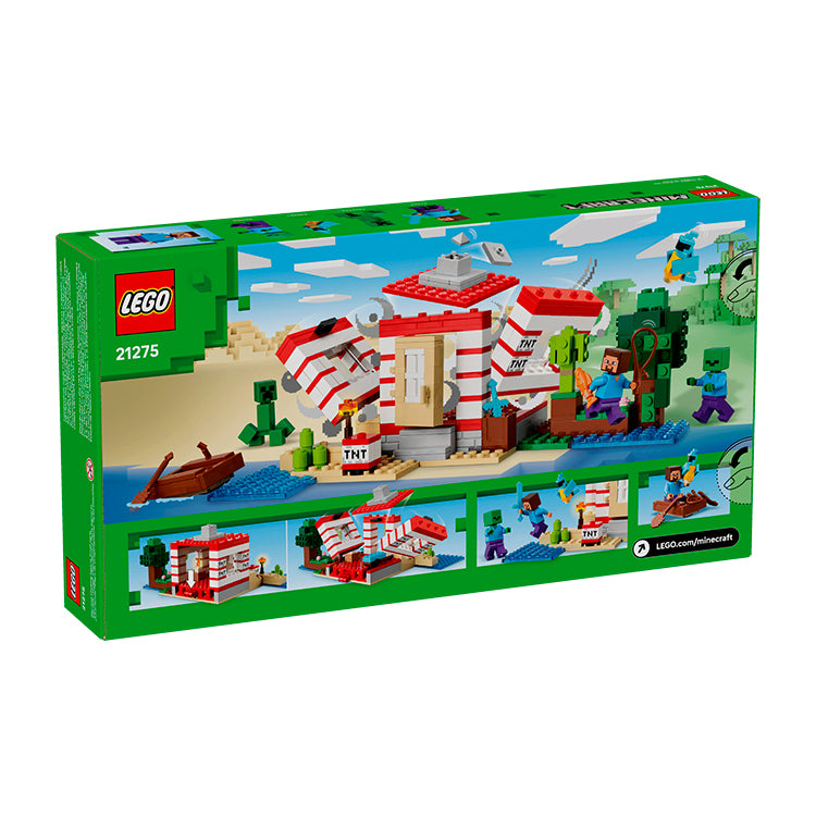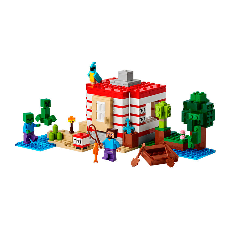 Byggemodellen af et hus ligger i Minecraft-junglebiomet og ligner en stor version af spillets ikoniske TNT-element. Med en kontakt på siden kan børn udløse en TNT-eksplosionsfunktion, får hele huset til at kollapse. Når støvet har lagt sig, kan børn genopbygge huset, så det er klar til nye eventyr. Minifigurer af Steve, en Creeper™ og en zombie inspirerer til fantasifuld leg og kampaction. Det autentiske LEGO Minecraft tilbehør omfatter båd, fiskestang, fisk, papegøje og jungleplanter. Med LEGO® Builder appen kan børn får ekstra sjov ved at bruge deres enhed til at zoome ind på og dreje modeller i 3D.
