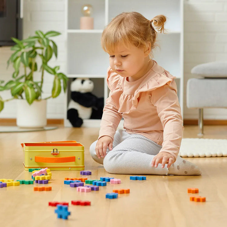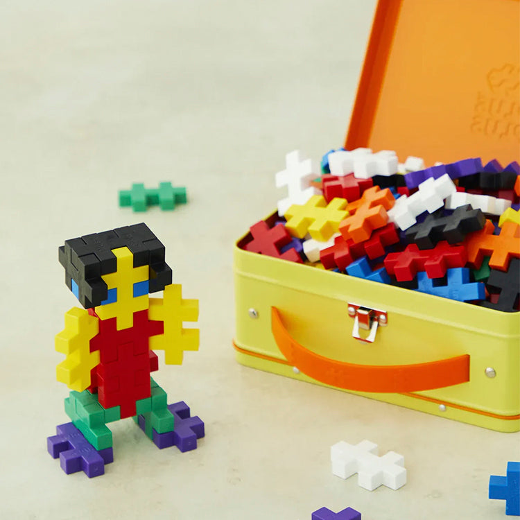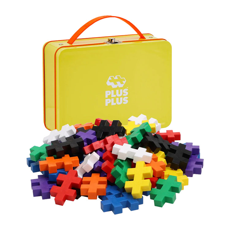 Børn kan bygge deres egne kunstværker og tage Plus‑Plus med overalt takket være den handy metalkuffert.
