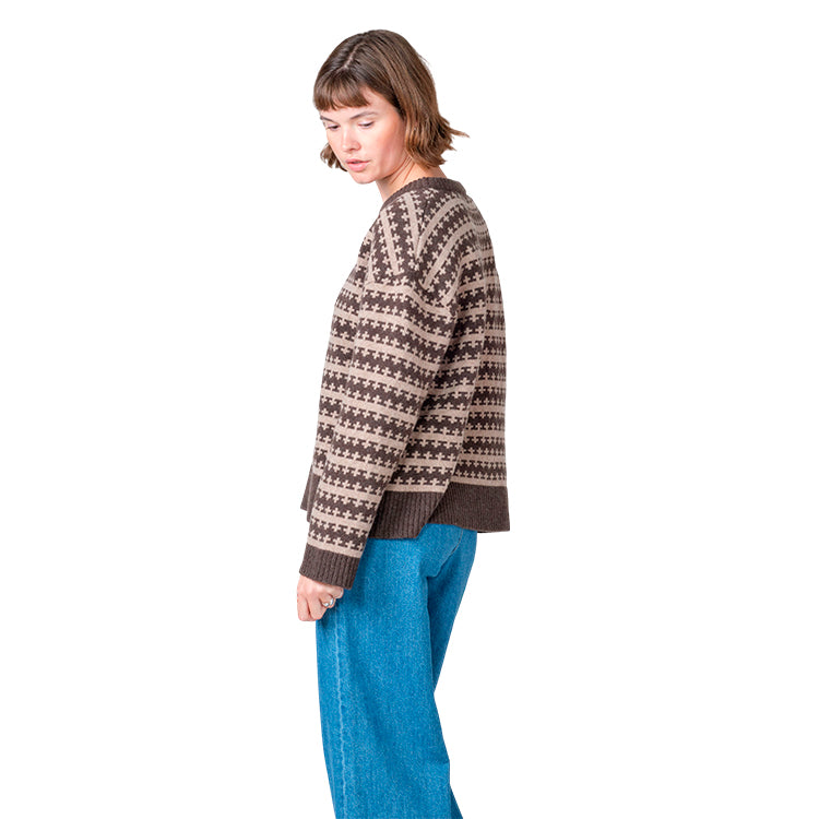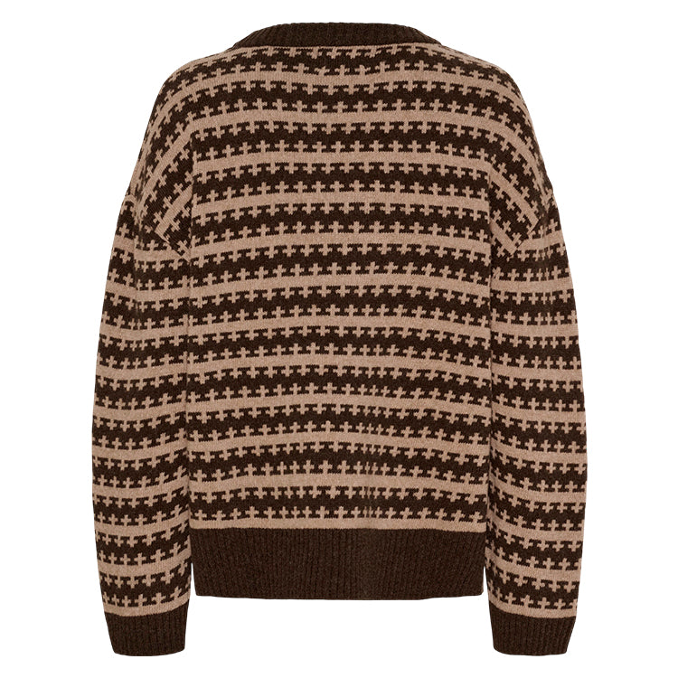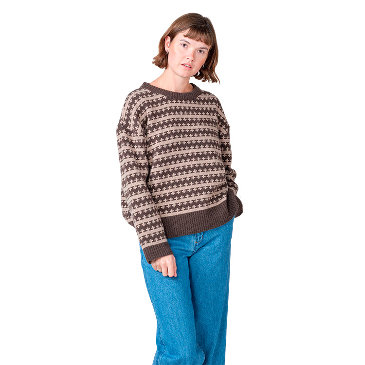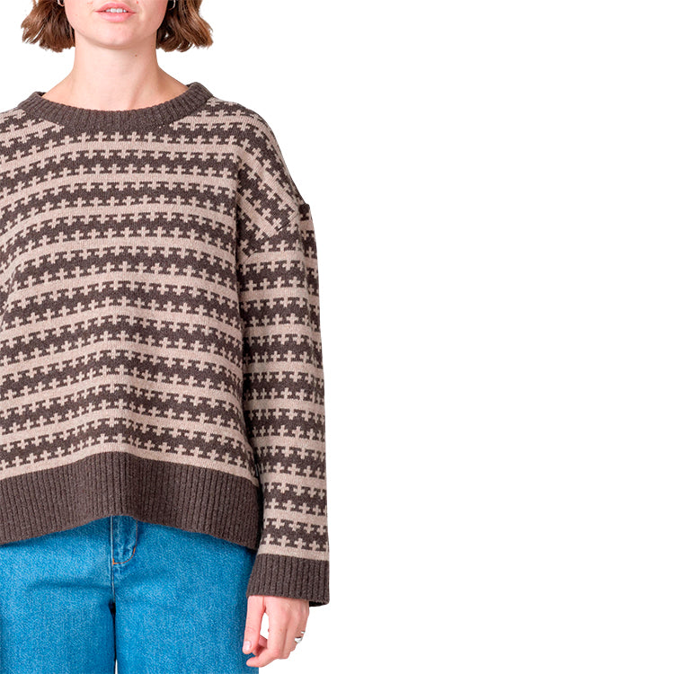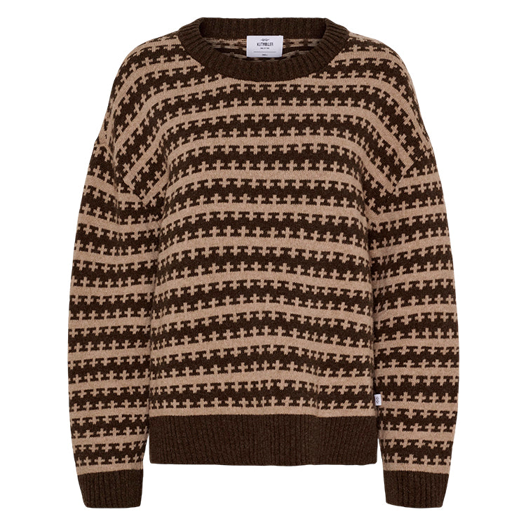 Kitti Knit fra Klitmøller Collective er en mønstret strik med drop-skuldre, rund hals, en bredere rib i manchetter og bund samt bredt skårne, lange ærmer som detalje. En rummelig strik med gennemgående mønster der bærer et skandinavisk præg.