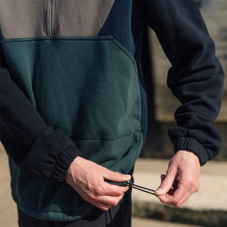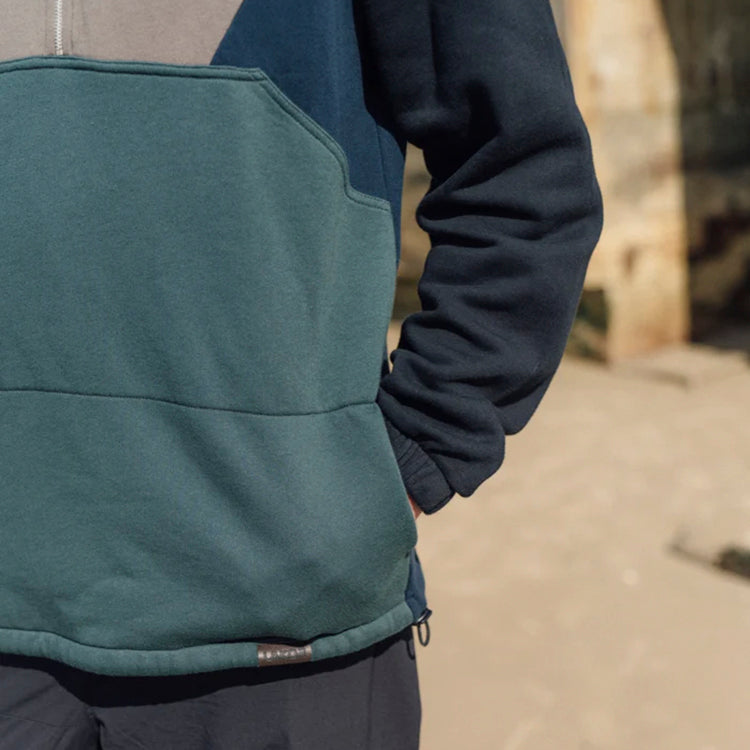 Den er fremstillet i økologisk bomuld, og med sin rummelige pasform er der garanteret maksimal komfort i både den lokale sportshal eller på farten mod et nyt eventyr. Med sin halve lynlås kan man nemt regulere temperaturen, og den store kængurulomme giver plads til alt fra kolde hænder til små fornødenheder.