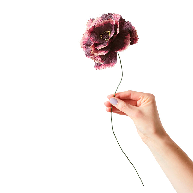 Denne fine blomst er lavet af gennemfarvet crepepapir og monteret på en lang, bøjelig grøn stilk. Stilken kan du let forme, så du kan få den form og længde du ønsker. Pæonen er en smuk blomst kendt for sine store, fyldige blomsterhoveder i flotte farver. Den blomstrer i foråret og forsommeren men som papirblomst, kan den pryde dit hjem året rundt.